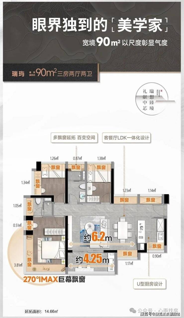 约90㎡三房两厅两卫:横厅设计,南北通透,客餐厨LDK一体化,户户270°豪宅飘窗,可分可合中西双厨,实用面积达103%