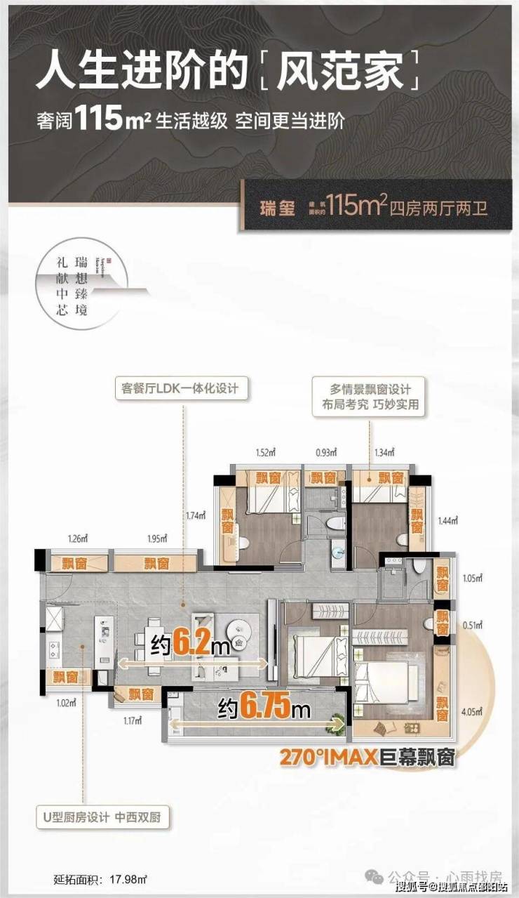 约115㎡四房两厅两卫:不设限的豪宅四房,客餐厨LDK一体化,户户270°豪宅飘窗,可分可合中西双厨,实用面积达103%