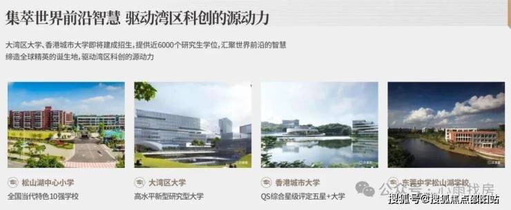 大学:松湖瑞府虹吸松湖优质教育圈,片区设有东莞理工学院、大湾区大学(在建)、香港城市大学(在建)等