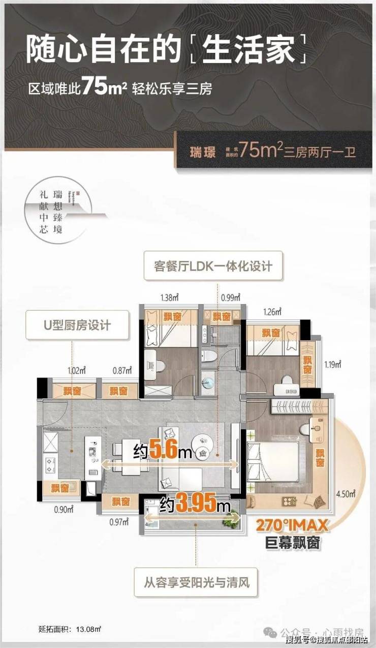 约75㎡三房两厅一卫:片区唯一75平精装大三房,客餐厨LDK一体化,户户270°豪宅飘窗,可分可合中西双厨,实用面积达103%