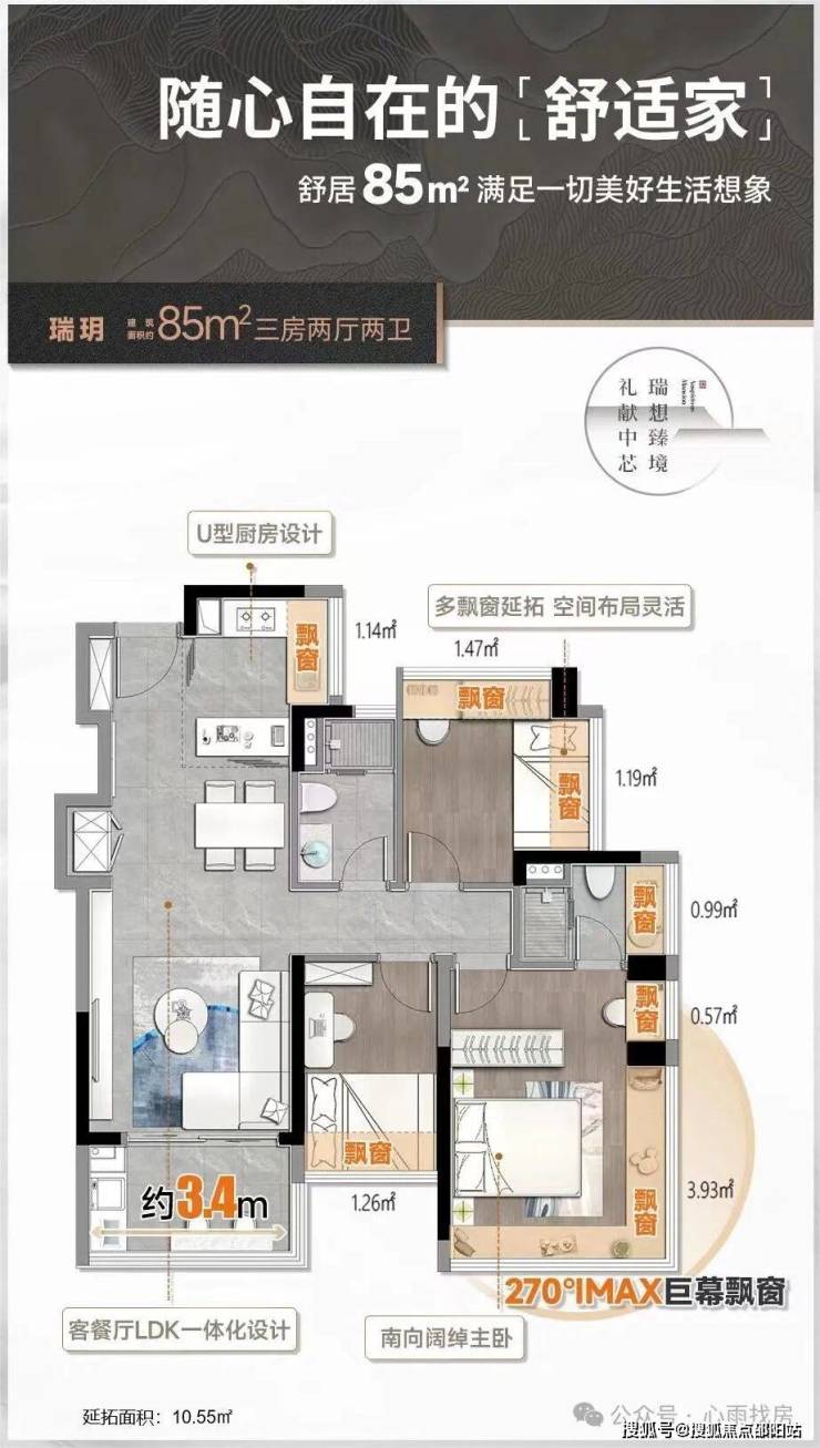 约85㎡三房两厅两卫:灵动竖厅,科学布局,客餐厨LDK一体化,户户270°豪宅飘窗,可分可合中西双厨,实用面积达98%