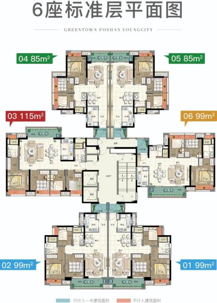 【6栋户型】85方三房、99方横厅三房、99方竖厅三房、115方四房