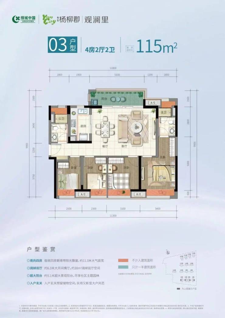 君兰河岸公园、300米长城市公园、1500方泳池花园、南北水系花园四公园环绕