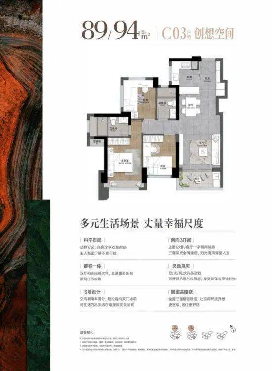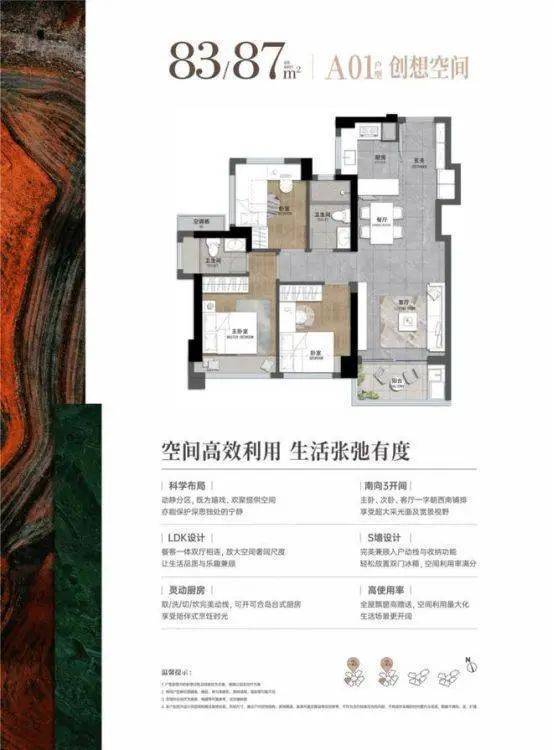 建面约83-113㎡臻装3-4房,户型方正,高使用率,极致空间利用,更能满足精致生活需求。LDKG一体化客餐厅,S墙体冰箱位,多飘窗设计,视野采光更佳,空间实用满分。