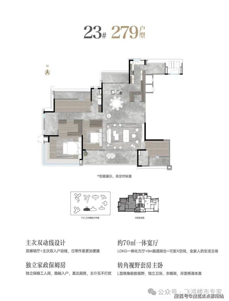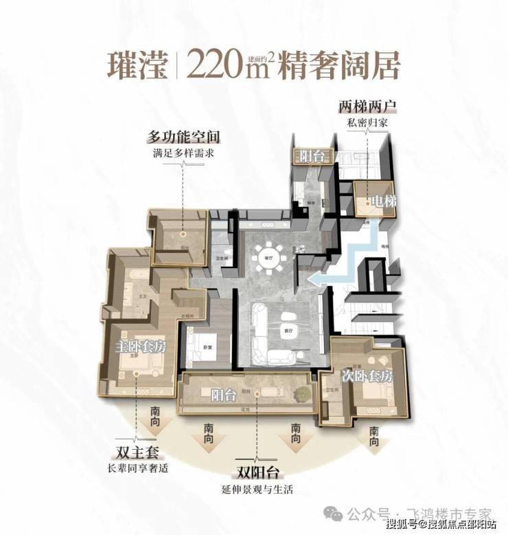 310平方米五房则展现了高端住宅的空间艺术。该户型拥有10米长的跑道式阳台,双主套设计满足多代同住需求。约20米的南向大面宽,配合高达38%的窗地比,带来了270°流光巨幕,环幕式滨水绿州、繁华城景直接呈现在面前。