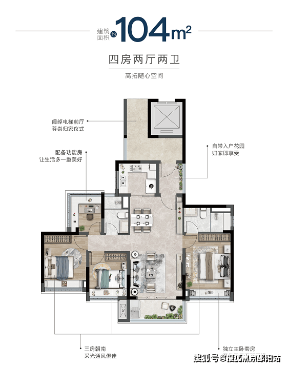 建面约104-168㎡纯改善四房,朝南而居,南北通透,阳光清风常伴,满足品质改善需求。
