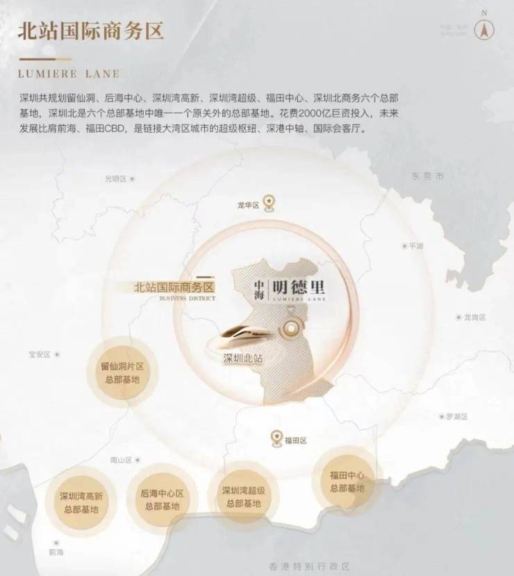 2)北站国际商务区,深圳六大总部基地之一,高投入打造国际化城市会客厅;项目距离深圳北站直线约2公里,所在民治街道是龙华目前发展的核心区域;明德里,于双区之中,在重点产业走廊之上,区域优势得天独