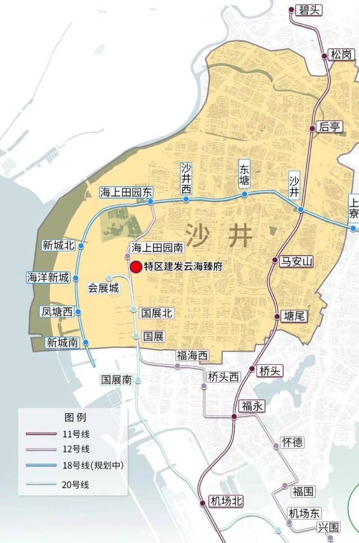距12号线海上田园南站约50m、距20号线会展城站约500m。毗邻深圳机场码头、海洋新城超级码头(规划中)、国际邮轮港(规划中),距深圳宝安国际机场约10km,距穗深城际铁路沙井西站约3km。