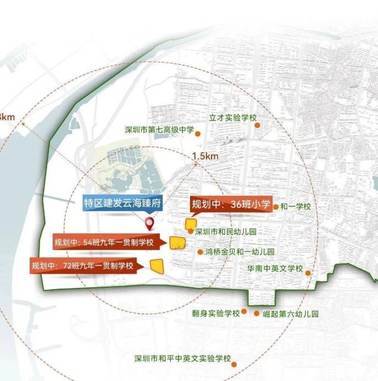 家楼下的18班幼儿园(在建)、蚝业小学(18个班,宝安区双优学校)、片区规划两所九年一贯制学校。