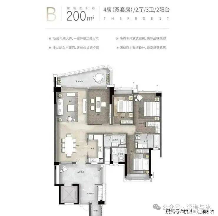 『天启』组团面积约140-250㎡环幕临江大平层,坐拥江景第一排,眺望小蛮腰,享500米宽阔无遮挡江景视野,并邀请三大全球知名设计大师倾力打造,并配备12大国际一线品牌交标,专梯专户四房双套房设计,世界灵感前沿作品礼献广州!