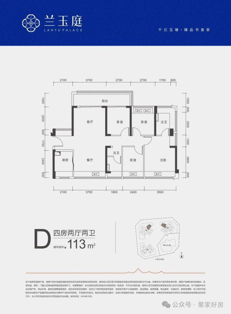 113㎡的4房2厅2卫,D户型,设计的是竖厅南北通透格局,客厅开间3.7米,4个卧室分别做到了3.5米/2.7米/2.7米/2.4米的宽度,客厅连接次卧出6.4米长的大阳台,U型厨房,公卫三段式分离,得房率约79%(不含赠送),阳台主朝西北或东北向。