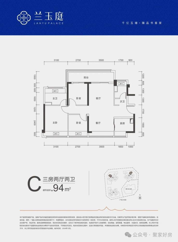 94㎡的3房2厅2卫,C户型,设计的是竖厅南北通透格局,客厅开间3.5米,3个卧室分别做到了3.1米/2.7米/2.7米的宽度,客厅连接次卧出6.2米长的大阳台,U型厨房,公卫三段式分离,得房率约79%(不含赠送),阳台主朝西北或东北向。