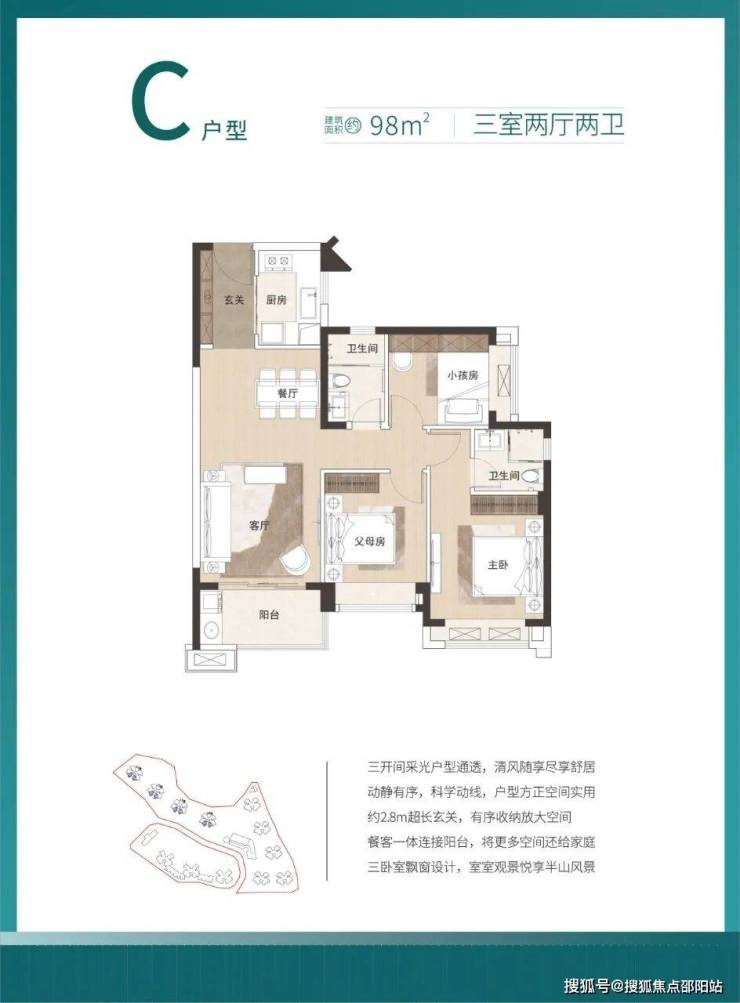 100㎡ 通透性三房两厅2卫大三房,2.5m超长玄关,南北通透,景观大阳台。