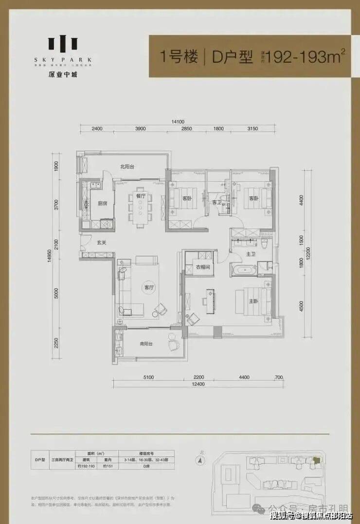1栋:产品是面积段为137-185-192㎡的3房、212㎡的4房、以及4套300㎡以上的顶层复式单位,其中36层及以下为2梯3户“品”字形结构,37层及以上为2梯2户的板楼结构;