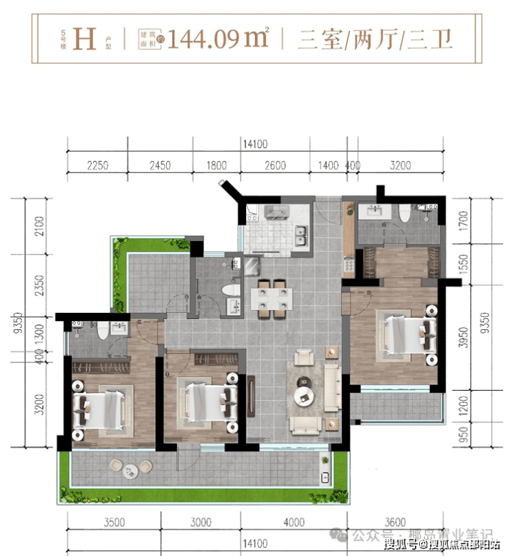 ✨5#楼H户型约144㎡三房两厅三卫