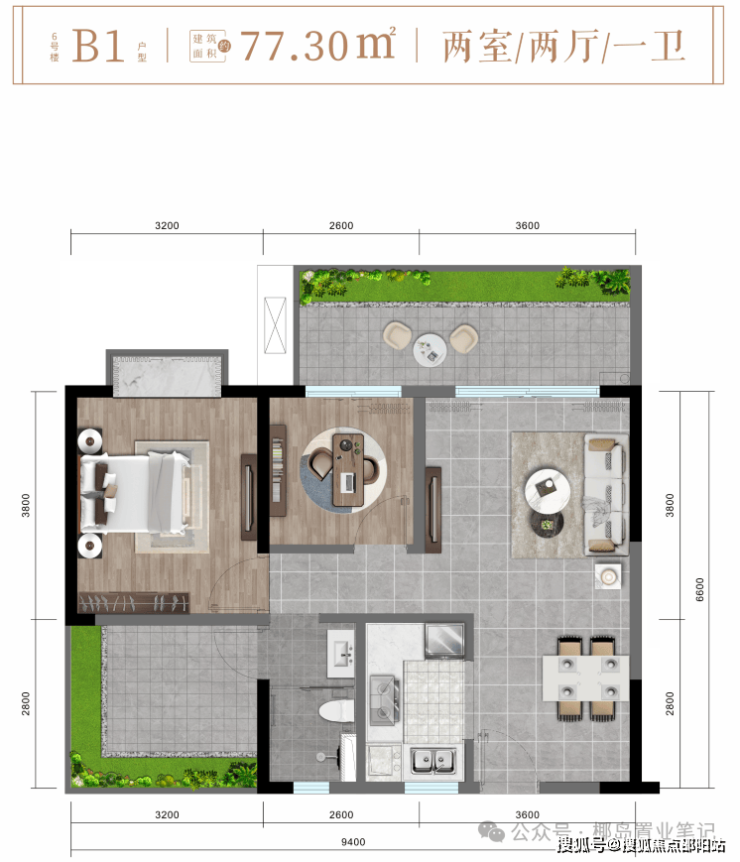 ✨ 6# 楼B1户型约77㎡舒适两房两厅一卫