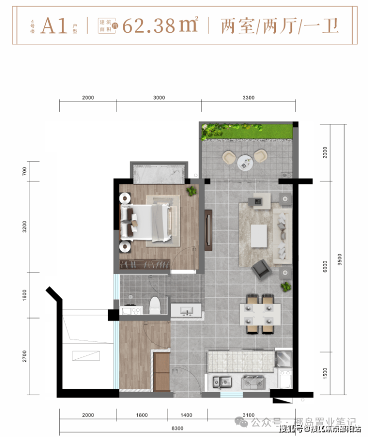 ✨4#楼 A1户型约62㎡精致两房两厅一卫