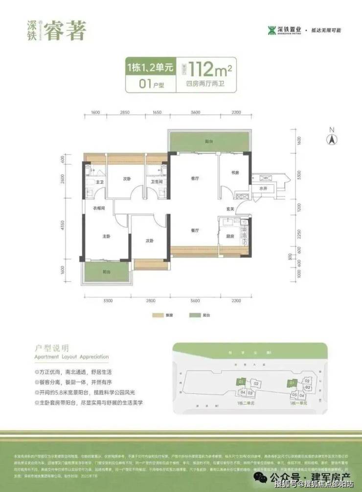 112㎡的4房2厅2卫,1栋1/2单元01户型,设计的是竖厅南北通透格局,进门入户玄关,客厅3.6米开间,实测高达23.88㎡餐客分离,餐厨一体设计,四开间朝南,主卧套房带阳台,4个卧室分别做到了主卧17.21㎡/次卧9.55㎡/次卧8.1㎡/次卧5.72㎡(实测面积,去掉墙体),客厅连接次卧出9.28㎡的巨幕大阳台,U型厨房,卫生间干湿分离,得房率约:80%(不含赠送),阳台主朝东北向看科学公园。套内面积89.6㎡+赠送面积16.1㎡=实用面积105.7㎡,加上赠送后得房率约94.37%。