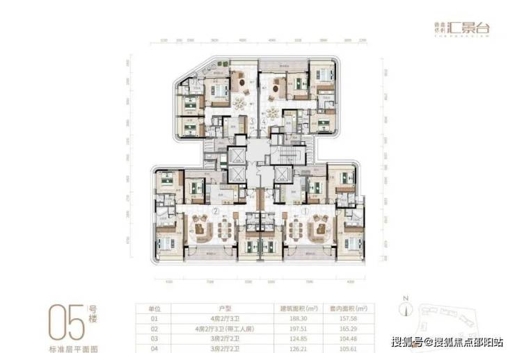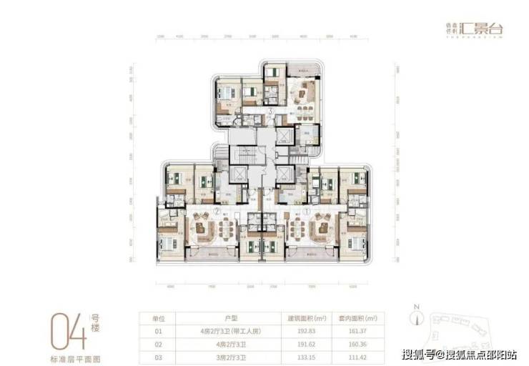 项目由14栋12层小高层组成,产品涵盖123-352㎡三至五房,共8类户型,户型实用率约82-84%