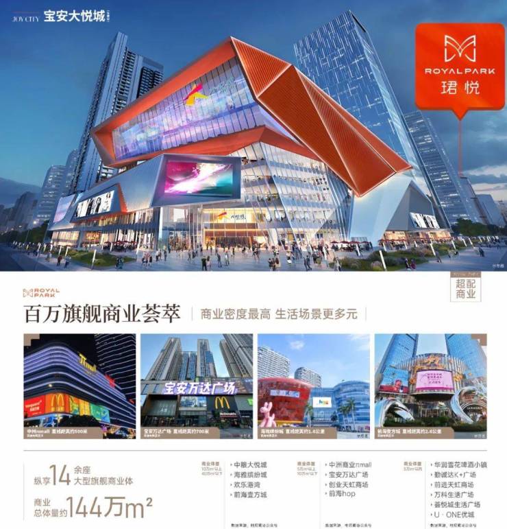 商业配套:项目自带的商业体量约3.1万㎡,同时紧邻深圳首座中粮大悦城(规划约16万㎡商业MALL,预计2025年开业),形成区域核心商圈。1公里范围内还聚集了中洲πmall(6万㎡)、宝安万达广场(19.8万㎡)、海雅缤纷城(36万㎡)及壹方城(36万㎡)等大型商业综合体,覆盖零售、餐饮、娱乐等多业态需求。此外,项目周边社区底商丰富,步行范围内可满足日常生活采买需求。