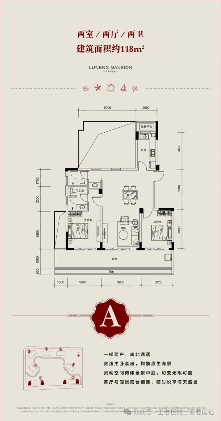 A户型:约118㎡2房2厅2卫(幻变4房),延展后可使用面积约155平米,南北双阳台