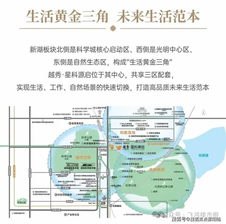 新湖板块北侧是科学城核心启动区、西侧是光明中心区、东侧是自然生态区,构成“生活黄金三角”。