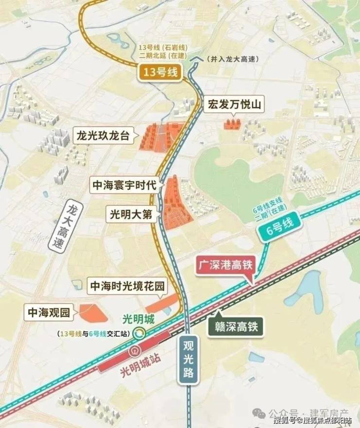 光明城高铁站,也是广深港高铁线和赣深高铁进入深圳的第一站,周边还邻近观光路,光侨路,深圳外环高速,龙大高速等主要交通要道。