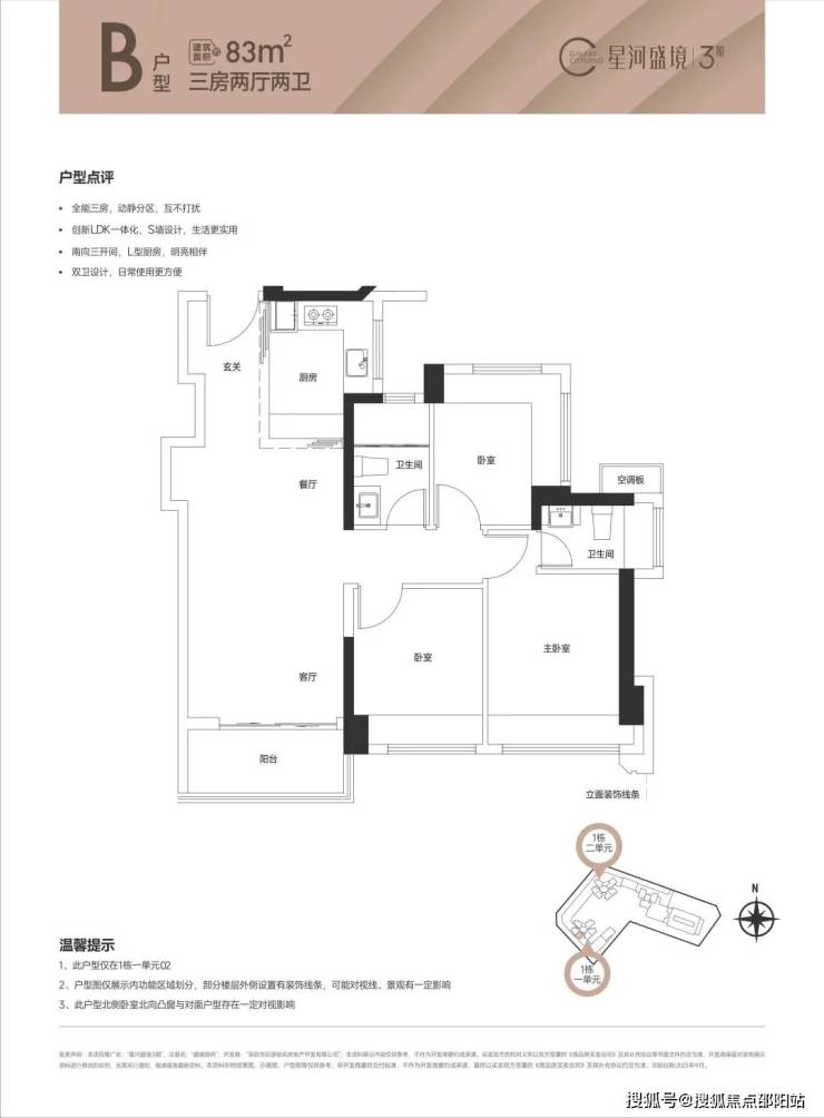 2,这期产品设计的户型实用率高,83平方三房2卫的户型,还带精装修