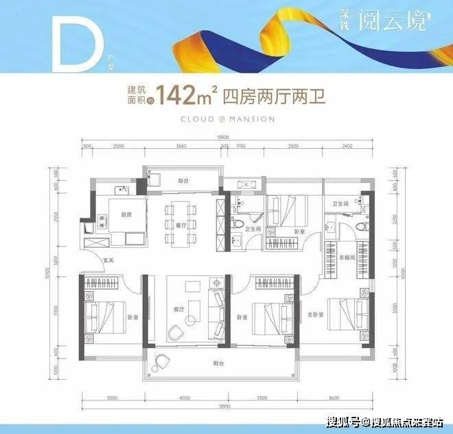 142㎡的4房2厅2卫,(D户型,1栋2单元05户型)设计的是竖厅南北通透格局,客厅4米开间,四开间朝南,双阳台设计,4个卧室分别做到了3.6米/3.3米/3米/2.8米的宽度,主卧大套房设计,客厅连接次卧出7.3米长的大阳台,U型厨房,得房率75-77%(不含赠送),大阳台主朝东南朝向。