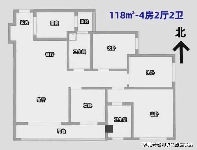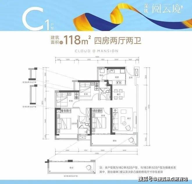 118㎡的4房2厅2卫(C1户型,1栋2单元/3单元03户型),设计的是经典竖厅格局,进门独立玄关,客厅3.5米开间,LDKB一体化设计,动静分区,四开间朝南,4个卧室分别做到了3.2米/2.8米/2.55米/2.35米的宽度,客厅连接次卧出6.4米长的大阳台,二字型厨房带1个小生活阳台,得房率75-77%(不含赠送),阳台都是朝南向。