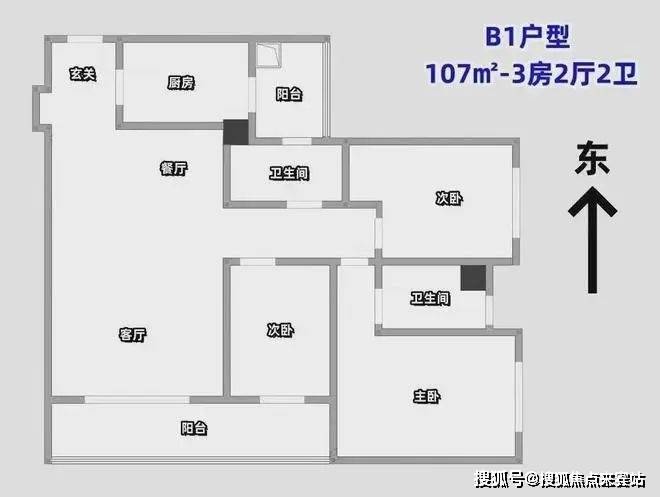 107㎡的3房2厅2卫(B2户型,1栋4单元03/04户型)设计的是经典竖厅格局,进门独立玄关,客厅3.5米开间,LDKB一体化设计,动静分区,3个卧室分别做到了3.15米/2.85米/2.65米的宽度,客厅连接次卧出6.35米长的大阳台,二字型厨房还带1个小生活阳台,得房率75-77%(不含赠送),阳台有朝西向、朝东向或朝南向。