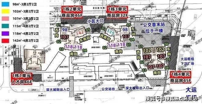 深铁阅云境广场:由深铁集团开发,总建筑面积约16万㎡,计容建筑面积约11.2万㎡,容积率6.1,绿化率40%,共由4栋总高32-46层的住宅组成,包含3栋商品房+1栋人才房,其中1栋1单元人才房46F,1栋2单元商品房46F,1栋3单元商品房32F,1栋4单元商品房45F。