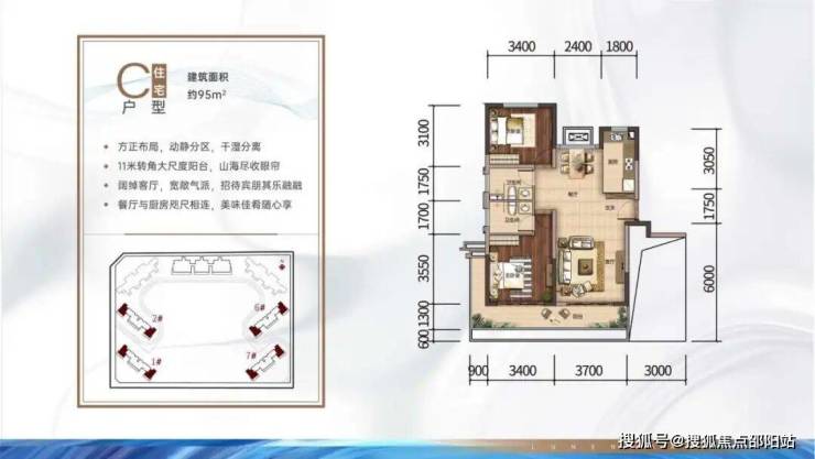 C户型:95㎡2房2厅2卫