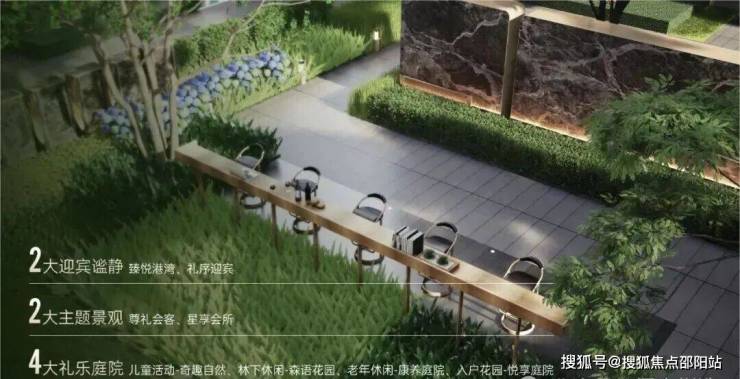 |“臻享森境”景观会客厅将自然之美与精致工艺融为一体,打造景观会客厅、艺术水景、户外吧台、阳光草坪等静谧空间。