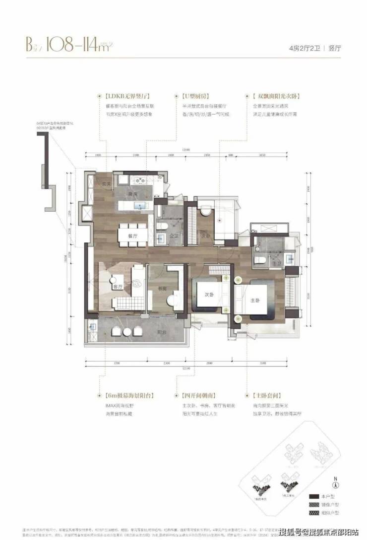 建面约108-143㎡海幕纯四房,臻藏级南向湾海视野,LDKB人性化动线设计,格局方正、高实用率,打造独立玄关、双飘窗主卧、步入式衣帽间等个性化空间。