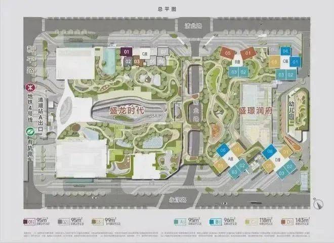 盛龙时代广场是龙华老城区近两年难得的地铁直连物业,4号线清湖地铁A口抬眼便可见项目。项目占地面积约 4.1万㎡,总建面约 24.4万㎡,共 8栋塔楼建筑,由 A座办公、B座公寓、C座住宅和保障房D座及裙房商业组成。住宅有4栋,共737户,套内面积 90以下小户型有646套,容积率为 4.9,停车位 761个,项目年限为 70年(2016年-2086年)。