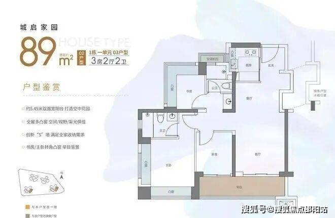 东南或西南朝向,竖厅设计,客厅有预留冰箱位,客厅,主卧,次卧分别朝南,户型一共有8个飘窗,加上阳台和飘窗使用率在90%左右。