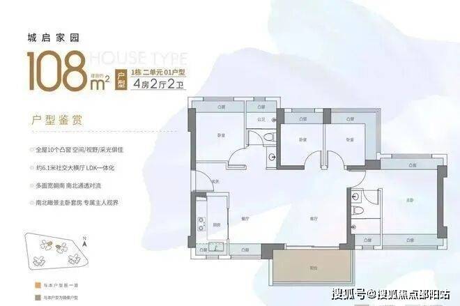 108㎡的4房2厅2卫,西南或东南向,横厅南北通透格局,进门独立玄关,客餐厅6.1米开间,主卧双飘窗通透设计,全屋10个凸窗,飘窗+阳台使用率在90%左右。