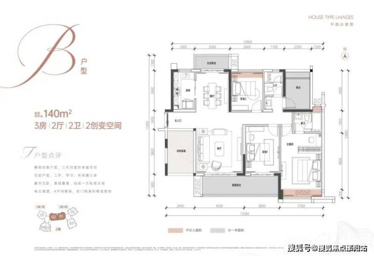 再来看面积大一些的建面约140㎡3+2房户型,是建面约128㎡的升级版,同样是四开间朝南,同样是短进深、大开间的设计,但多了一个卧室,就更适合三代同堂了。