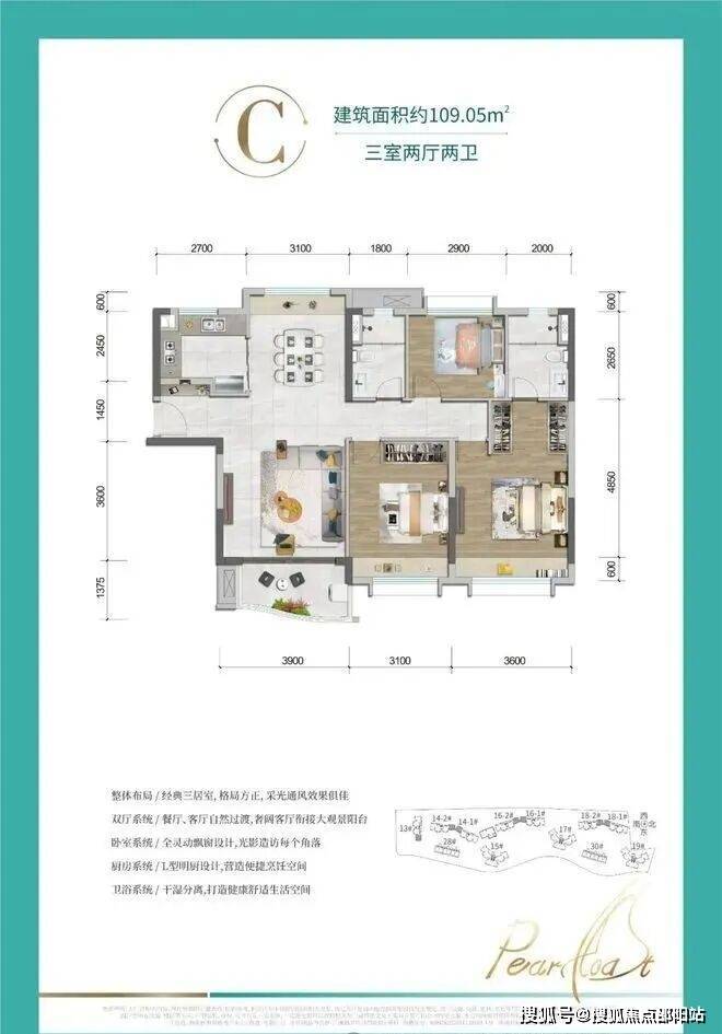 C户型-建筑面积约109㎡ 三室两厅两卫:格局方正,采光通风效果俱佳