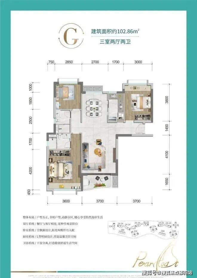 G户型-建筑面积约102㎡ 三室两厅两卫:户型方正,动静分区