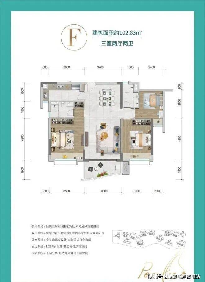F户型-建筑面积约102㎡ 三室两厅两卫:餐客厅一体化,L型明厨设计
