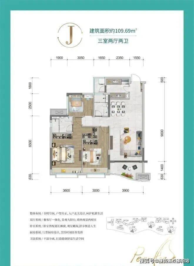 J户型-建筑面积约109㎡ 三室两厅两卫:餐客厅一体化,入户玄关设计