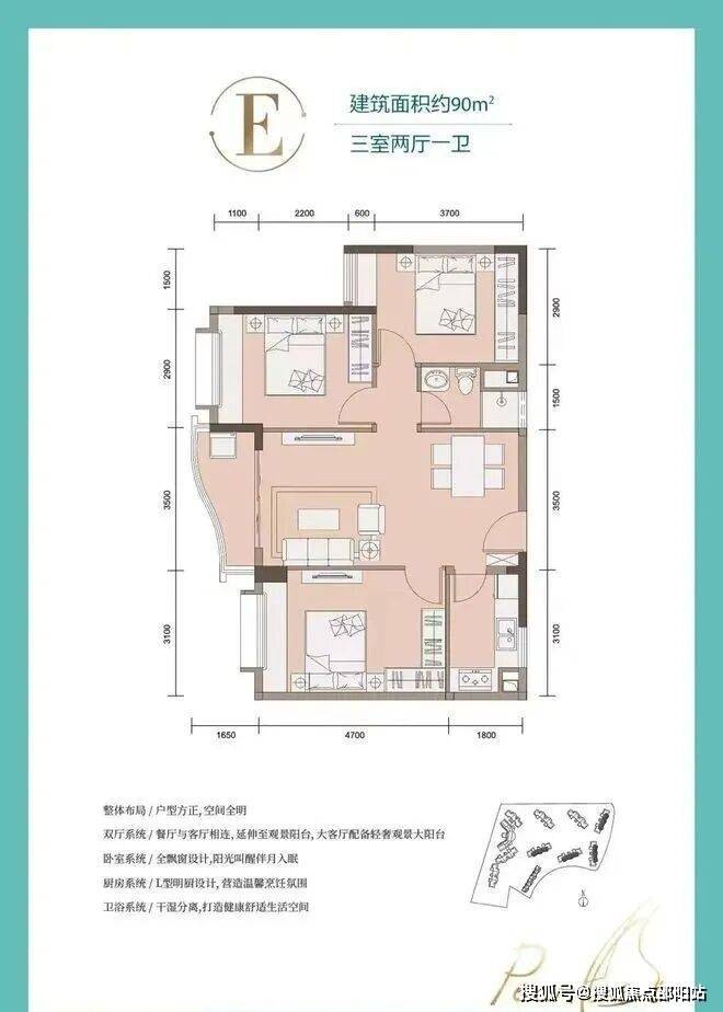 E户型-建筑面积约90㎡ 三室两厅一卫:餐客厅相连,配备轻奢观景阳台