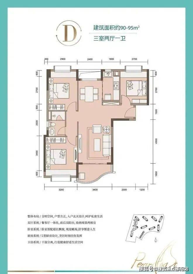 D户型-建筑面积约90-95㎡ 三室两厅一卫:餐客厅一体化,收纳观景两相宜