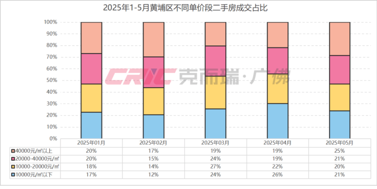 在成交结构上,克而瑞数据监测显示,5月黄埔二手房成交主力单价段为2-4万元/㎡,成交269套,占比达到48%,环比上月增长4%。
