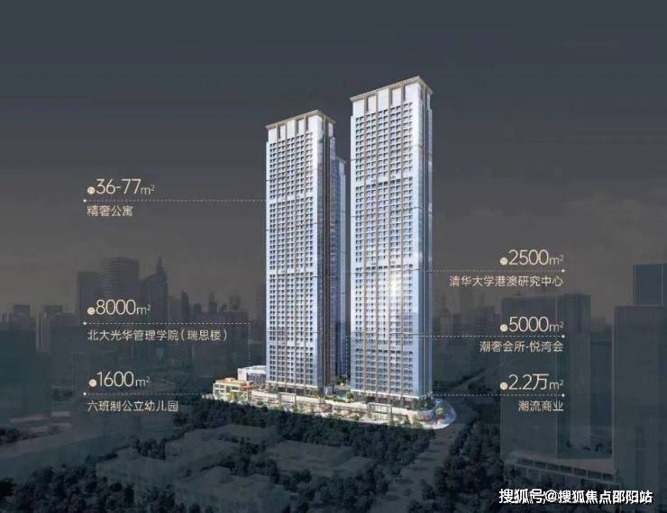 项目规划总建面约37万㎡,由四栋约200米超高层建筑以及下沉式商业组成,集精奢公寓、潮流商业、潮奢会所等多元规划于一体,同时集结了北大光华管理学院(瑞思楼)及清华大学港澳研究中心。其中,会所“悦湾会”约5000㎡,特邀全球排名前三的酒店设计事务所CCD执笔设计,以国际一流城市作标准,建构和、颜、悦、赏四大社交场域,满足多元化的社区生活。