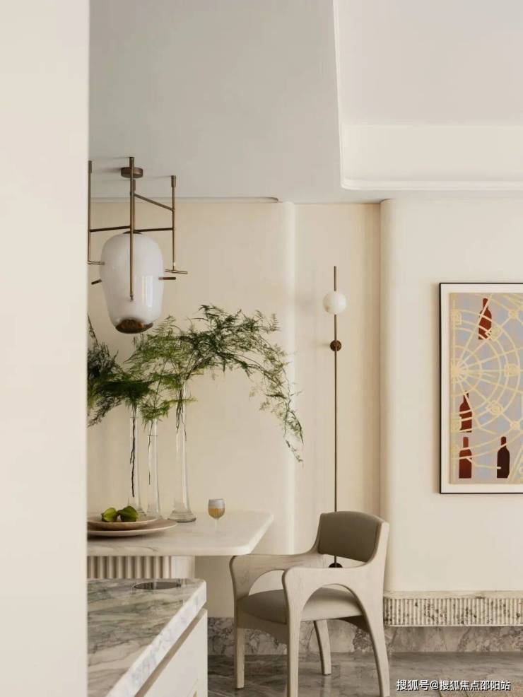 餐厅是洄游动线的「中转站」,容纳各个空间区域情绪的起承转合。一切舒适的感受来自设计在细微之处的思考和设置,有如散落光线的玻璃吊灯、触感温润的石材餐桌、竹节形态的白色花器,种种不同组成空间的和谐乐章。