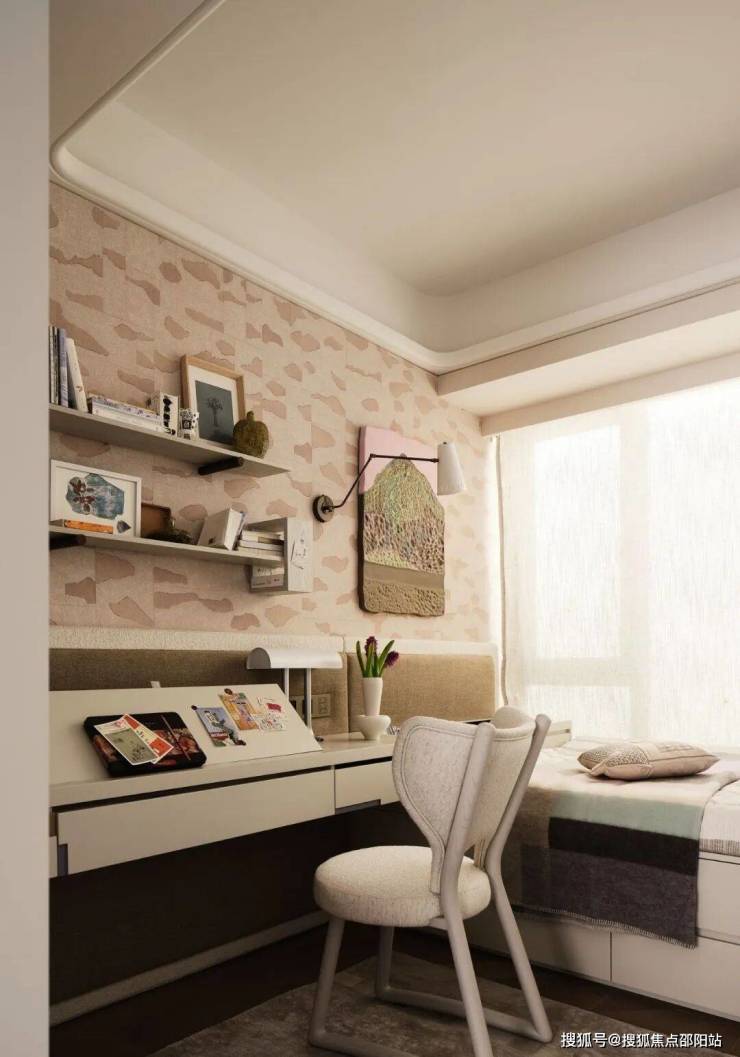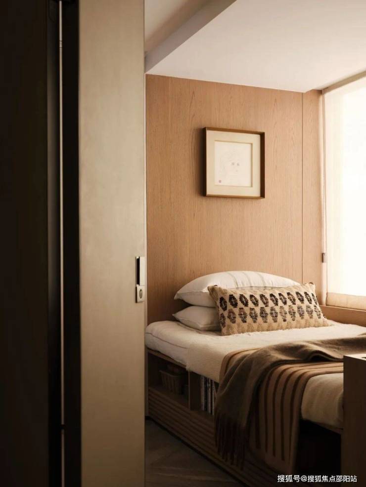 男孩房的床体利用飘窗进行整体设计,衣柜则「借用」客厅壁炉背景墙的空间,充分利用尺度并将空间感得以释放。折叠门让男孩房和X空间产生开合的交互关系,可私享也可共享,通过设计实现空间之间的联动性。