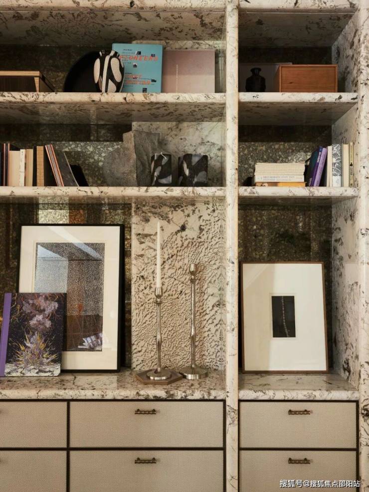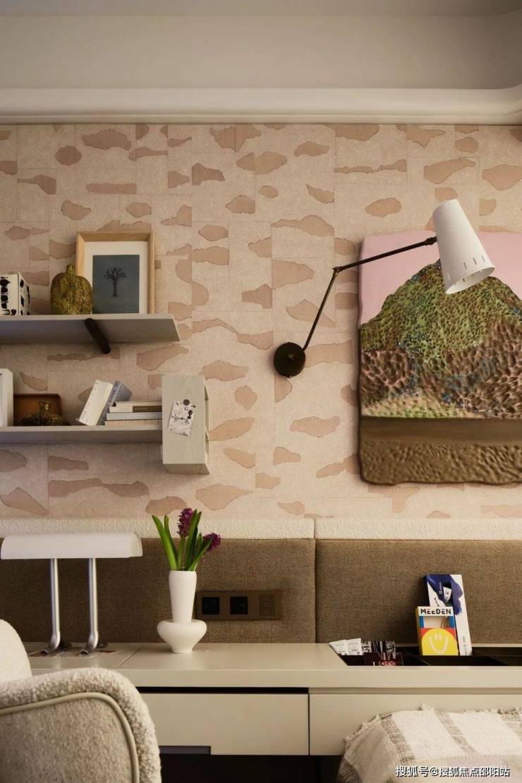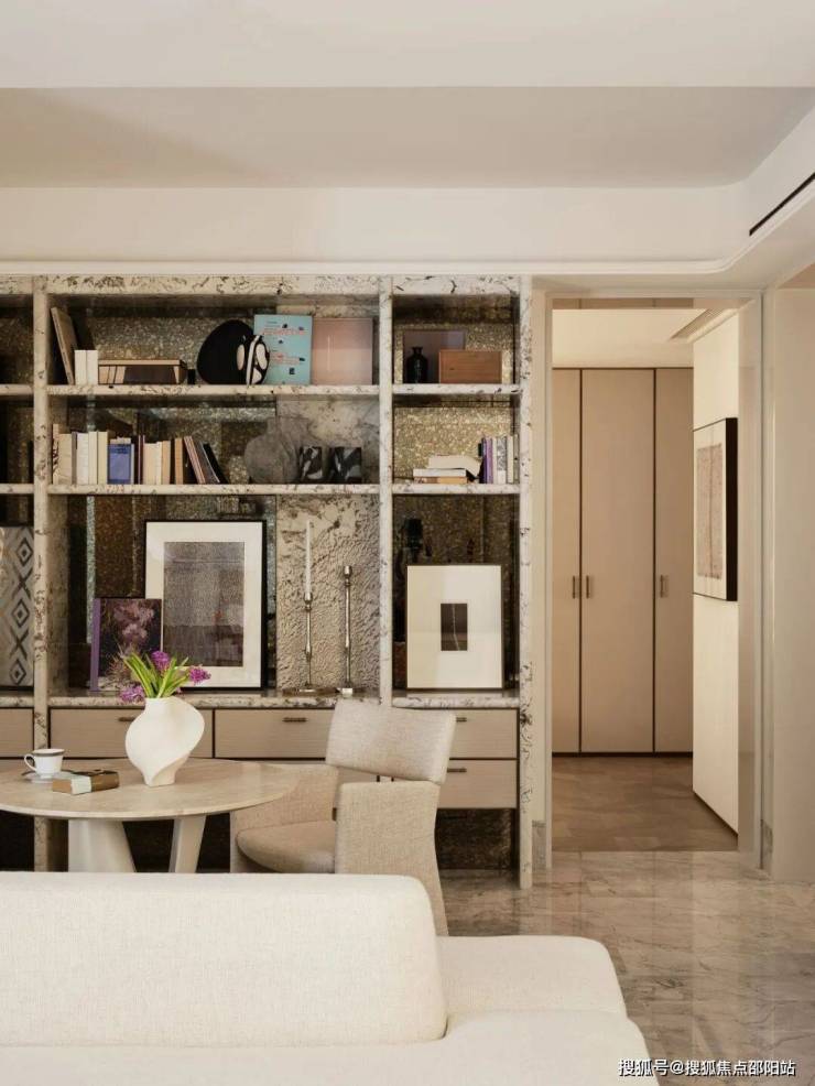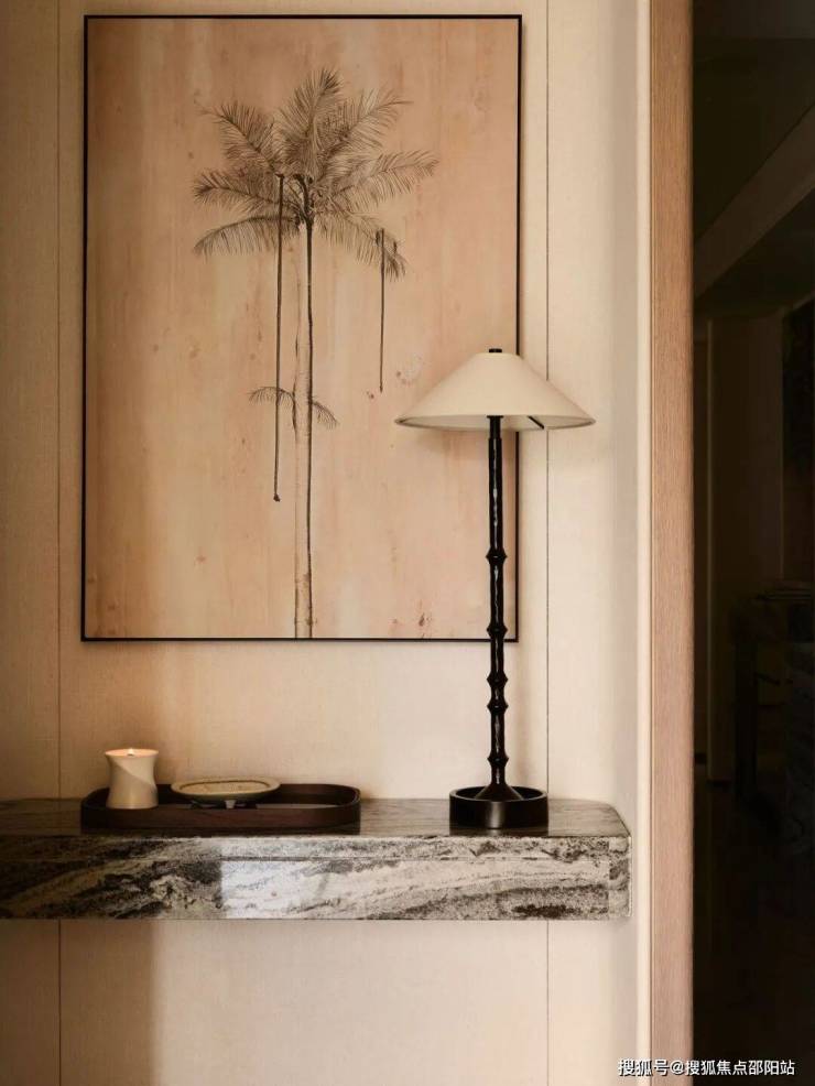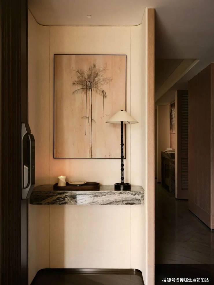 艺术玄关是洄游动线重要的构成部分,也是入户一眼定格的艺术角落,硬装使用弧形造型嵌套,柜体跟墙身饰面采用一体化的设计,让视觉焦点自然的被向内吸引。